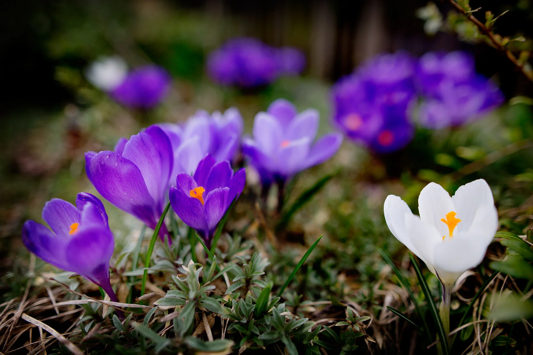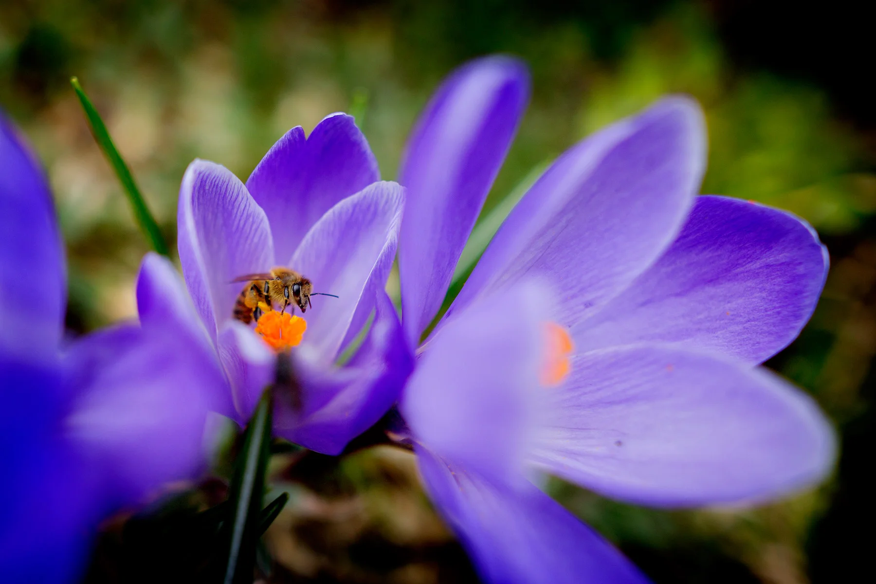 Bland krokusarna surrade det, vintervimmelkantiga lilla biet. Kunde knappt hitta rätt, stod på örona bland pistillerna.
