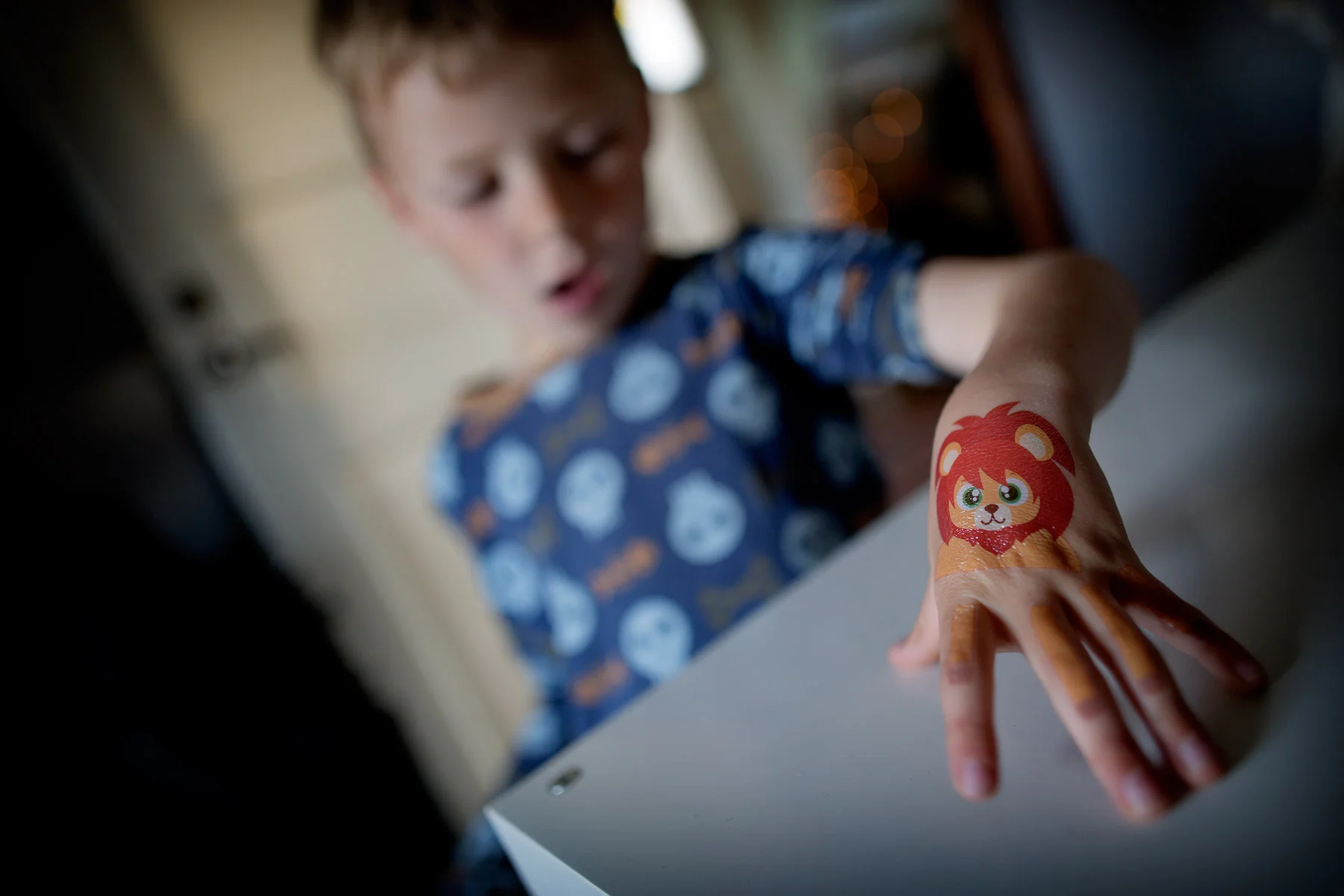Tänk så bra, att i brevlådan låg redan ett färdiginslaget paket, med namn och adress skrivet i blockbokstäver. Att det inte fanns nåt frimärke var inget unge herrn undrade över. Han slet lyckligt upp pappret och hittade ett ark med handtatueringar, lejon och gorillor med ben och svansar till fingrarna.