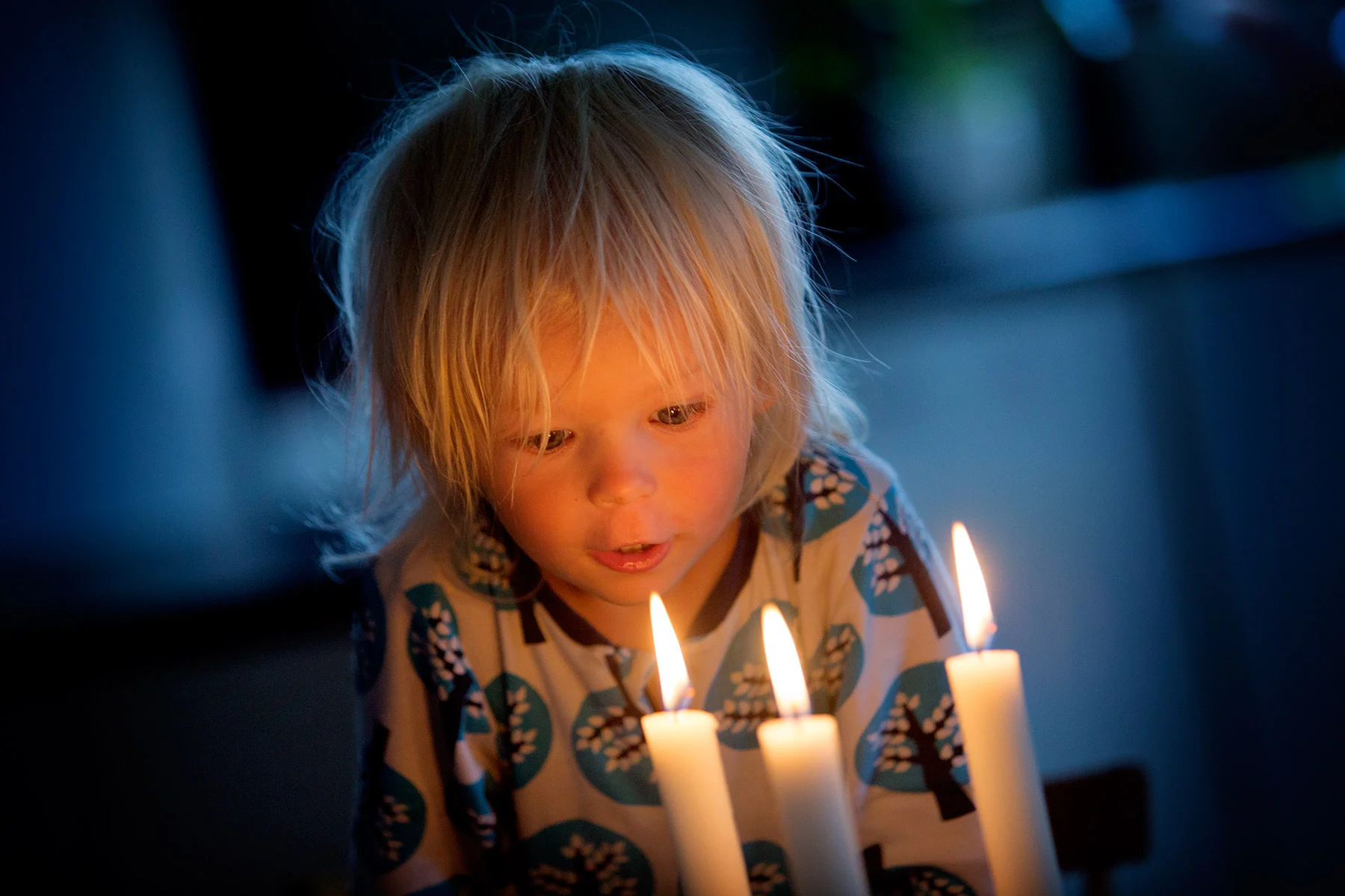 Den här lille killen då. Som ska BÅSA ut ljusen varenda morgon (så fort de tänds helst och sen tio gånger till) och som först drog ner filten från soffan, sen knycklade ihop den och ställde sej på den med båda fötterna, drog i ena hörnet för allt han var värd och utbrast: DEN E TARRK.