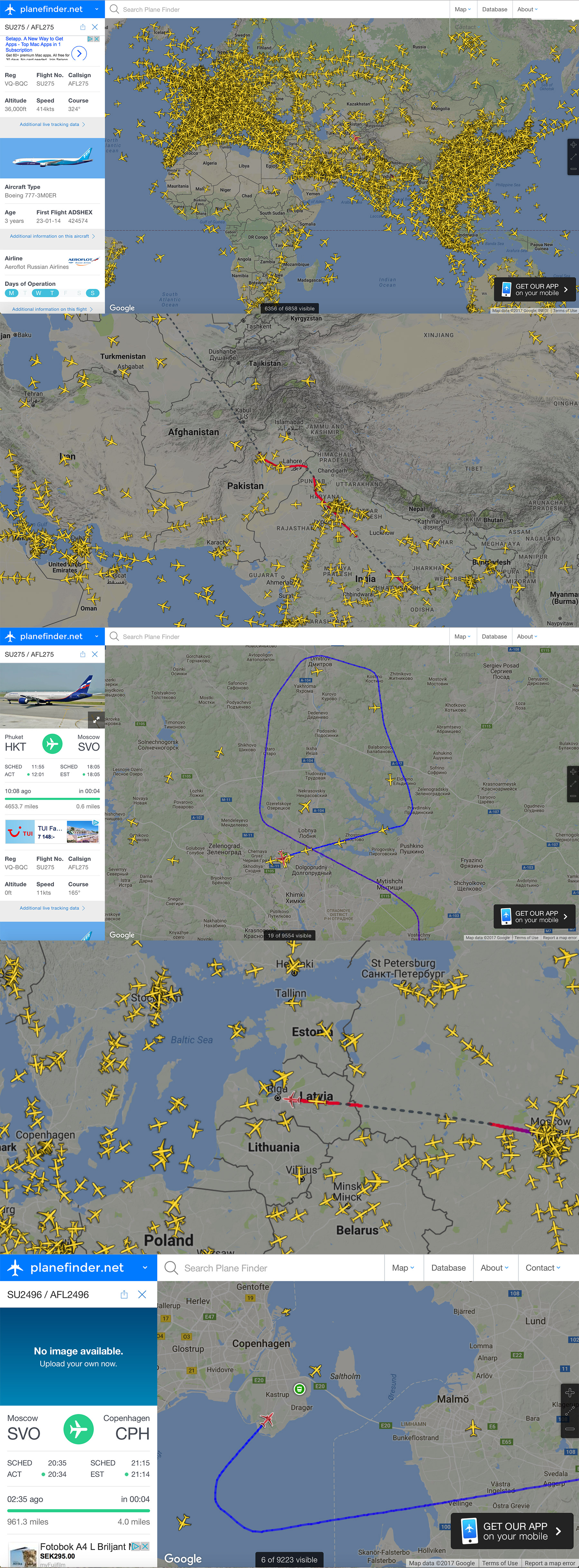 Idag flyger de hem. Idag flyger de Phuket-Moskva, Moskva-Köpenhamn, och jag sitter och glor helt nördigt på planens väg.
